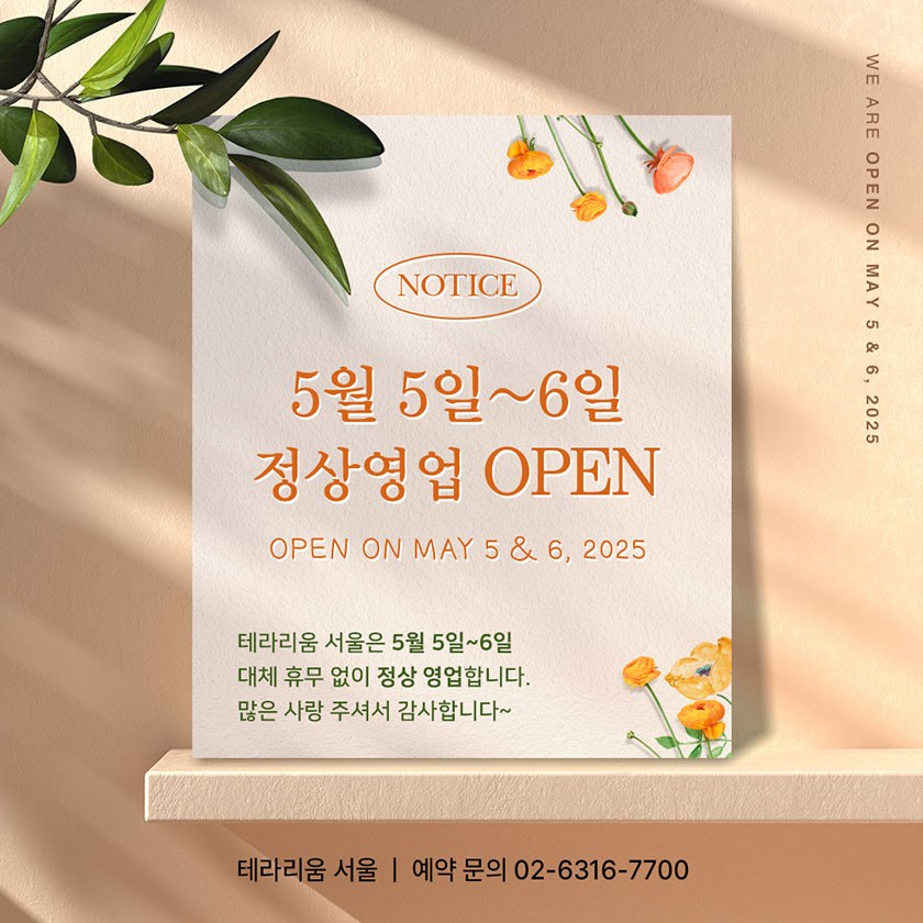 25년 5월 5일~6일 정상영업 OPEN 테라리움서울 2025.04.20 271 테라리움 서울은 5월 5일~6일대체 휴무 없이 정상 영업합니다.많은 사랑 주셔서 감사합니다~테라리움 서울 | 예약 문의 02-6316-7700 목록 이전글 2025년 추석 연휴 기간 영업 안내 다음글 다음글이 없습니다.